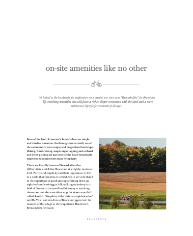 Born of the land, Braestone’s Remarkables are simple and timeless amenities that have grown naturally out of the community’s own unique and magnificent landscape. Hiking, Nordic skiing, maple sugar tapping and orchard and berry picking are just some of the many remarkable experiences homeowners enjoy living here.